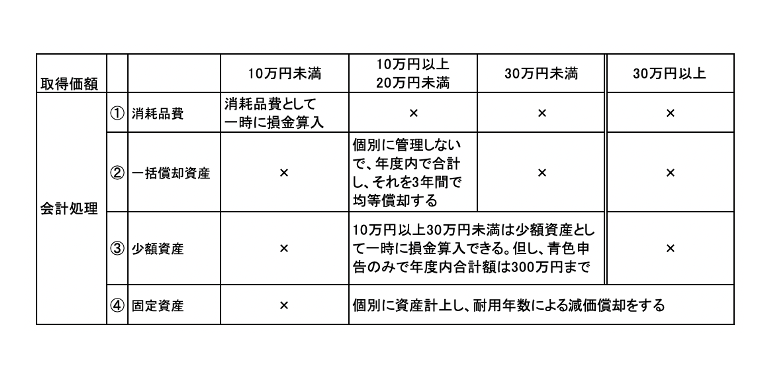 まず、①の消耗品費は、購入金額が10万円未満のものです。